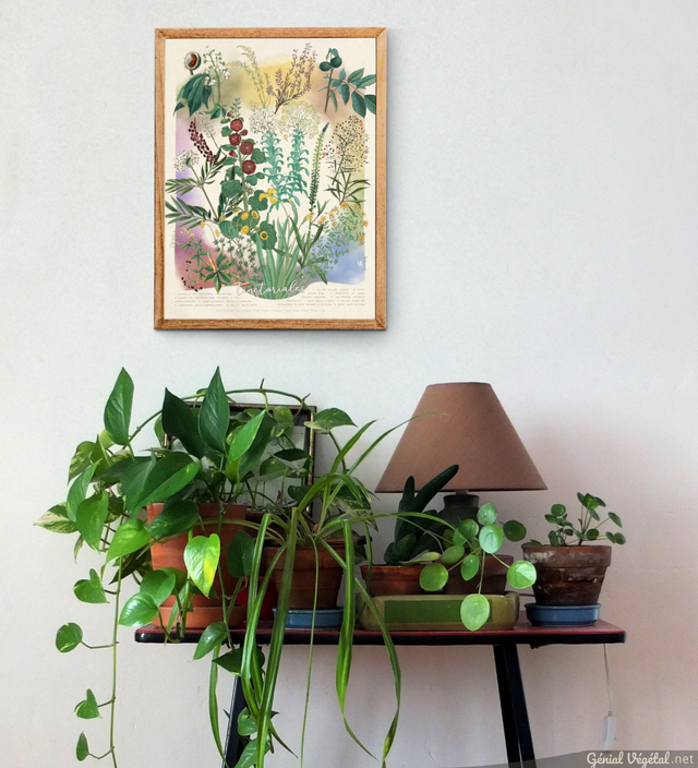 Création originale composée de gravures botaniques anciennes. Chaque plante est donnée avec son nom commun et scientifique.